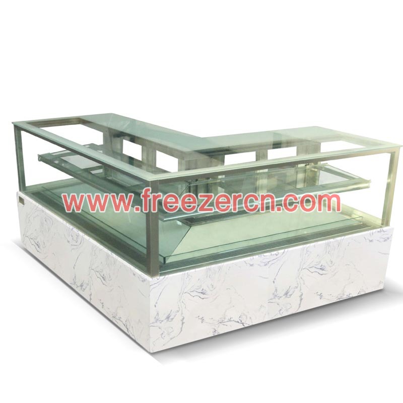 Double layer cake display cabinet with right angle 45 degree refrigerated food display showcases