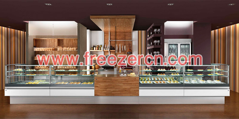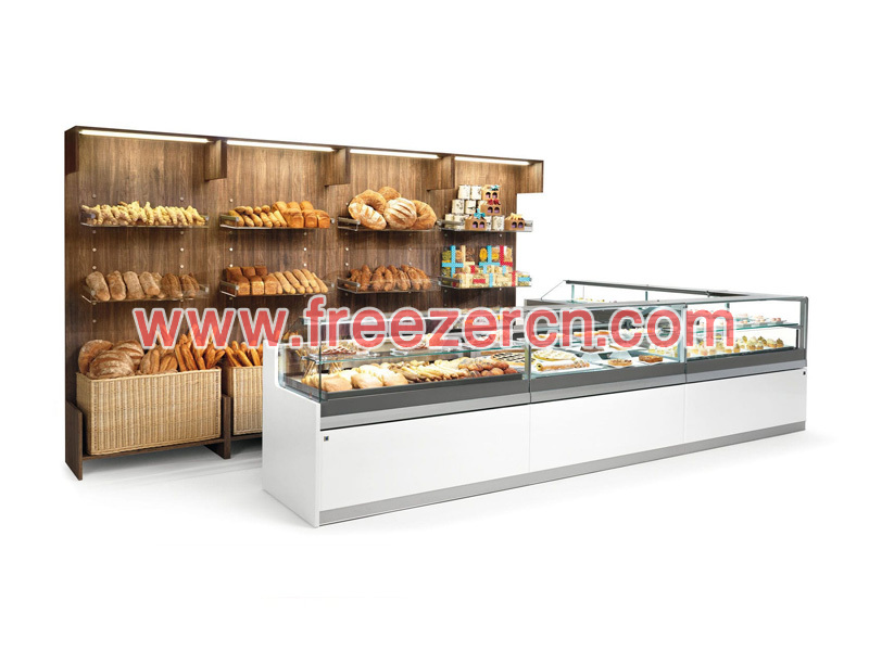 Double layer cake display cabinet with right angle 45 degree refrigerated food display showcases
